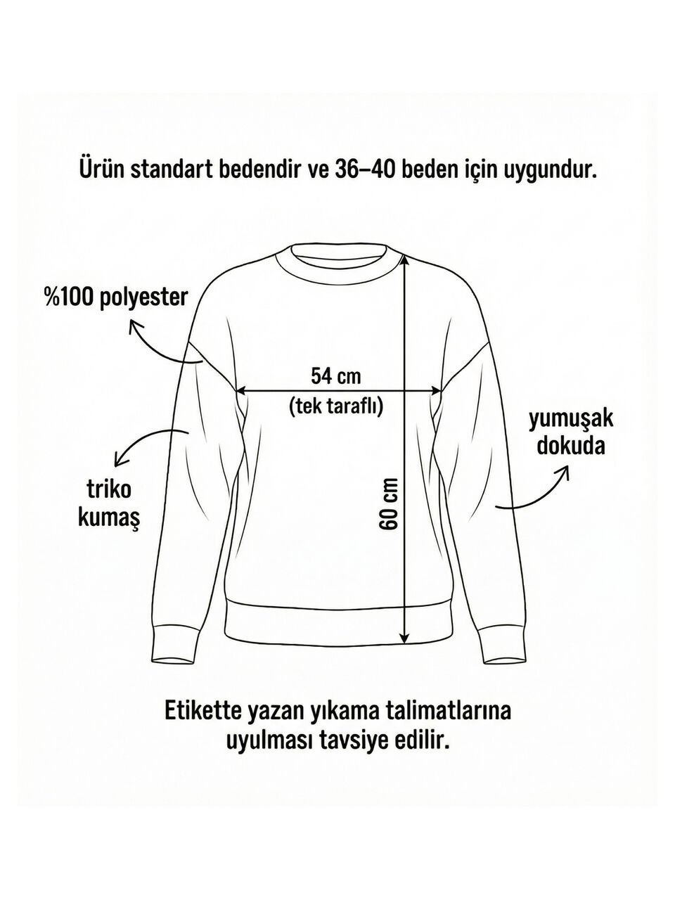 %100 Polyester. Triko kumaştır. Yumuşak dokudadır. 36-40 beden arası uyumludur. Koltuk altından koltuk altına 54 cm , boyu 60 cm dir. Etikette yazan yıkama talimatlarına uyulması tavsiye edilir.