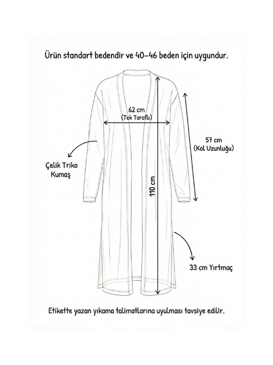 Ürünümüz Standart Beden olup, geniş kalıbı sayesinde 40, 42, 44 ve 46 beden kullanan müşterilerimiz için uygundur.